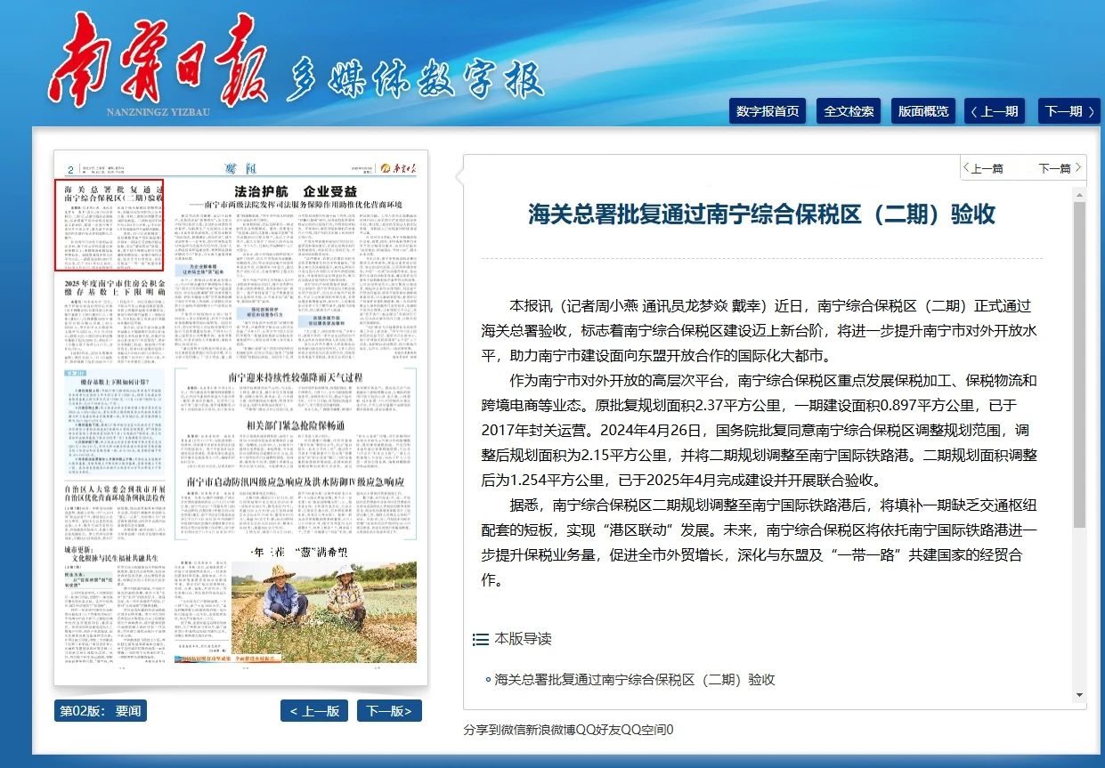 海關(guān)總署批復(fù)通過南寧綜合保稅區(qū)(二期)驗(yàn)收