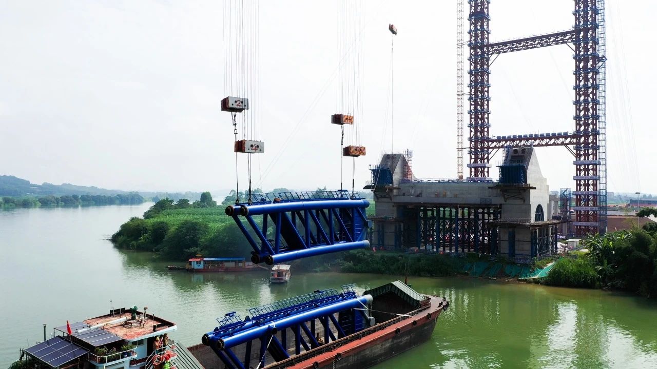 南寧南過境線公路上正右江特大橋首節(jié)拱肋順利安裝